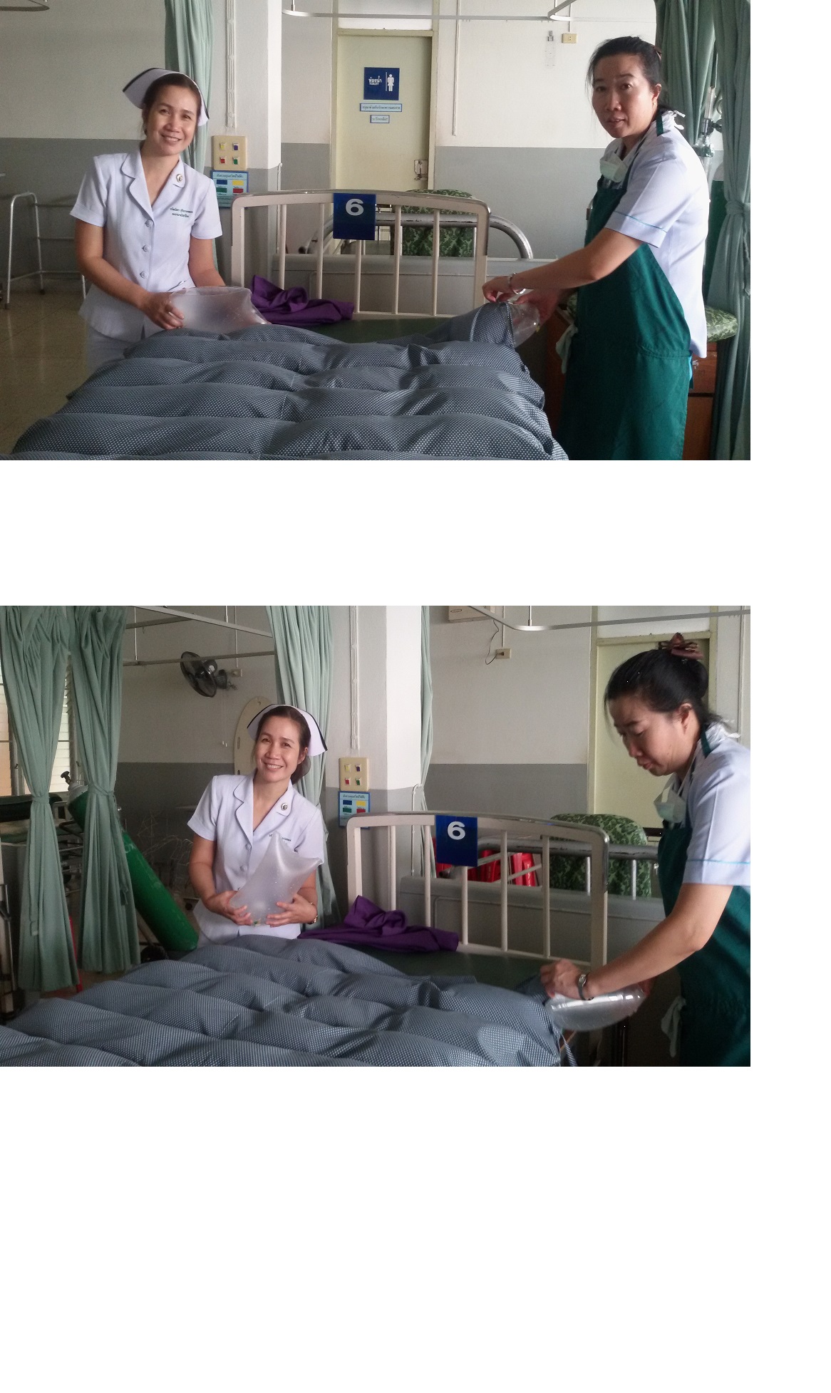 จากผลการทบทวนการปฏิบัติงานของหอผู้ป่วยใน พบว่า รับผู้ป่วยกลุ่มโรคอาการทางหลอดเลือดสมองและผู้ป่วยBed riddenมากขึ้น การดูแลผู้ป่วยกลุ่มดังกล่าวได้ใช้แนวทางการเฝ้าระวังการเกิดแผลกดทับ มีการใช้อุปกรณ์เตียงนอนลม แต่ยังเกิดอุบัติการณ์การเกิดแผลกดทับระดับ1 จำนวน 5 ราย และมีแผลกดทับระดับ 2 มาจากบ้าน จำนวน 4 ราย ในปี 2557 โดยการทบทวนการปฏิบัติงานยังพบว่า บุคลากรขาดการประเมินผู้ป่วยที่ชัดเจนและขาดการปฏิบัติตามแนวทางอย่างเคร่งครัด ประกอบกับยังขาดแคลนอุปกรณ์เตียงนอนลมที่เพียงพอ เนื่องจากหอผู้ป่วยมีเตียงนอนลมเพียง 2 เครื่องเท่านั้น และผู้ป่วยต้องนำไปใช้ที่บ้านด้วย แต่เนื่องจากที่นอนลม มีราคาประมาณ 12,600 บาท งานผู้ป่วยใน โรงพยาบาลสันติสุข จึงคิดค้นนวัตกรรมเพื่อทดแทนการใช้ที่นอนลมจากถุงน้ำยาล้างไตทางช่องท้องที่ไม่ได้ใช้แล้ว มาพัฒนาเป็นที่นอนลมสำหรับผู้ป่วย เสียค่าใช้จ่ายประมาณ 430 บาท ซึ่งเป็นการลดปริมาณขยะ ค่าใช้จ่ายในการกำจัดขยะ และค่าใช้จ่ายในการซื้อที่นอนลมและค่าไฟฟ้า สำหรับผู้ป่วยที่ไม่สามารถเคลื่อนไหวตนเองได้