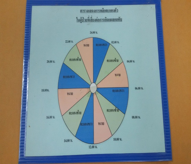 3.ติดนาฬิกาพลิกตะแคงตัวไว้ที่หัวเตียงผู้ป่วย ให้พลิกตะแคงตัวผู้ป่วยตามเวลานาฬิกาพลิกตะแคงตัว