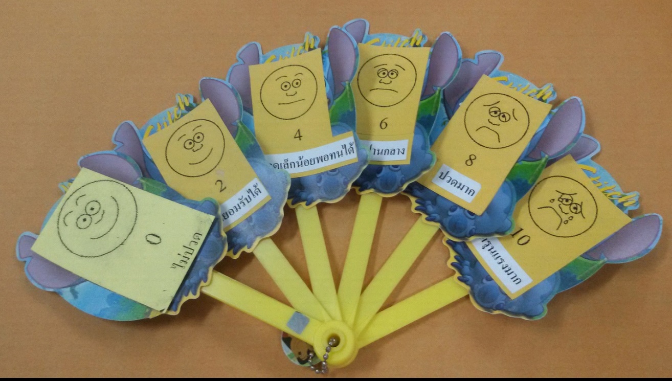 1.พิมพ์รูปภาพแสดงสีหน้าบอกความรู้สึก เริ่มตั้งแต่ไม่ปวด แทนด้วยภาพสีหน้ายิ้มร่า