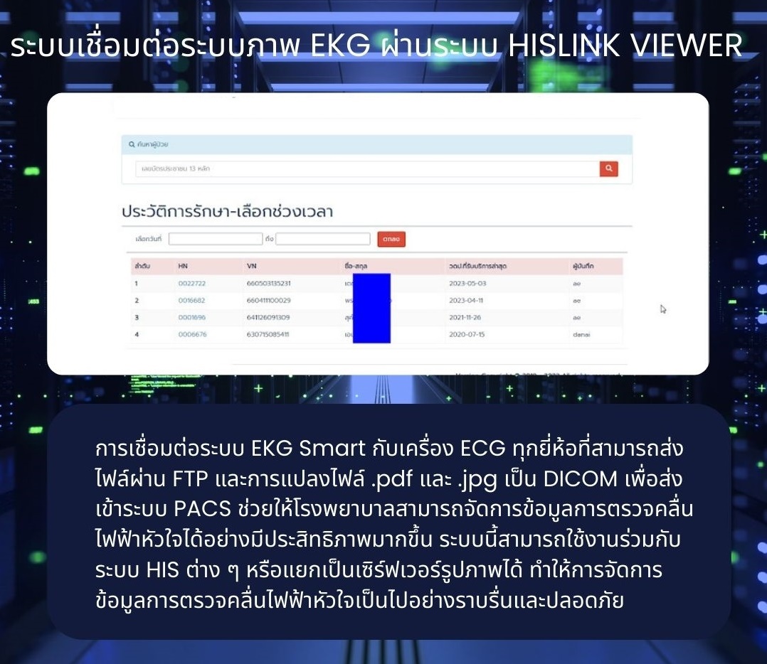 การเชื่อมต่อระบบ EKG Smart กับเครื่อง ECG ทุกยี่ห้อที่สามารถส่งไฟล์ผ่าน FTP และการแปลงไฟล์ .pdf และ .jpg เป็น DICOM เพื่อส่งเข้าระบบ PACS ช่วยให้โรงพยาบาลสามารถจัดการข้อมูลการตรวจคลื่นไฟฟ้าหัวใจได้อย่างมีประสิทธิภาพมากขึ้น ระบบนี้สามารถใช้งานร่วมกับระบบ HIS ต่าง ๆ หรือแยกเป็นเซิร์ฟเวอร์รูปภาพได้ ทำให้การจัดการข้อมูลการตรวจคลื่นไฟฟ้าหัวใจเป็นไปอย่างราบรื่นและปลอดภัย