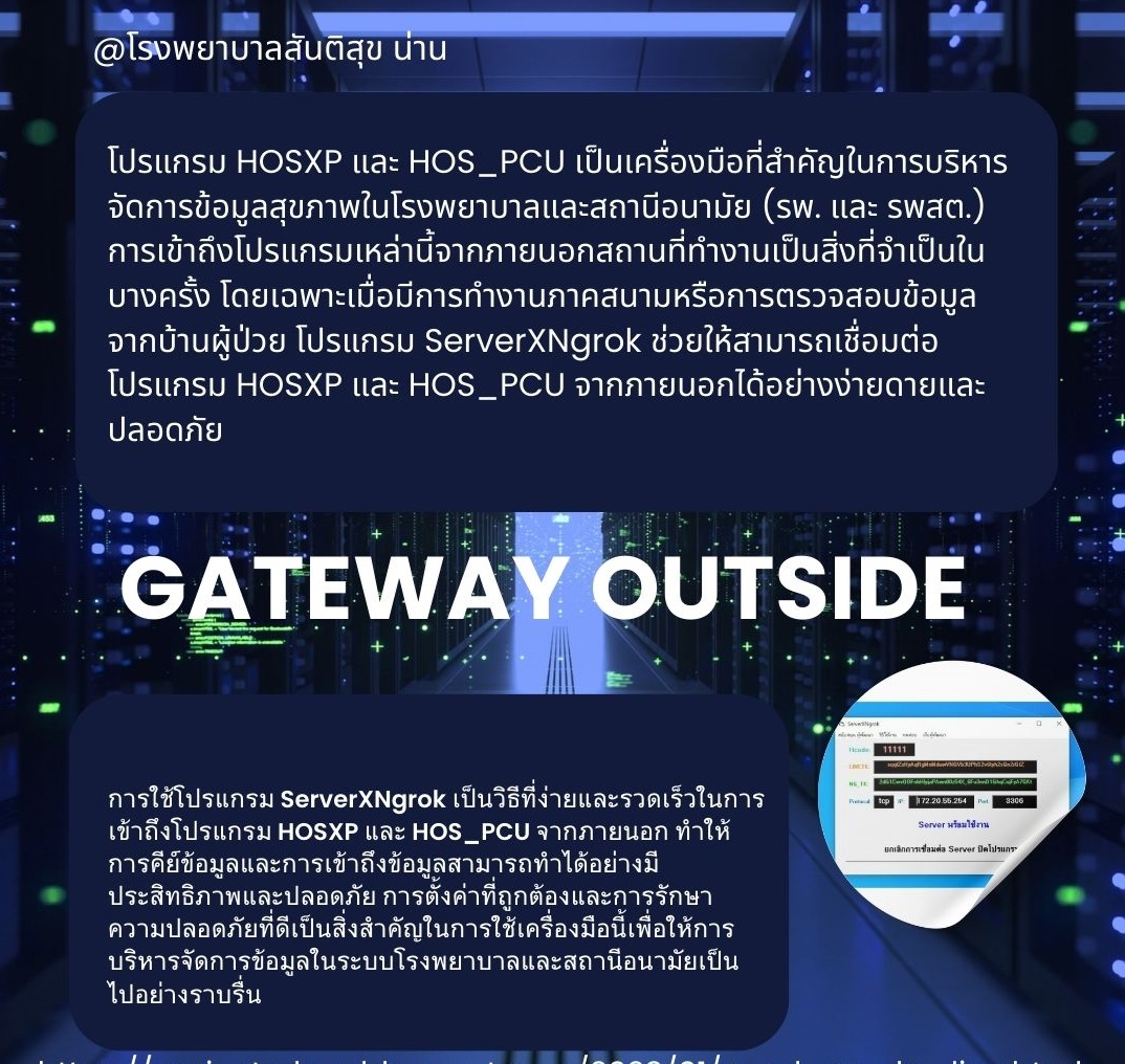 Gateway Get IP Outside สำหรับ ทำให้ ใช้โปรแกรม HOSXP HOS_PCU เพื่อเอาไว้คีย์ข้อมูลโปรแกรม นอกสถานที่เข้ามาในระบบ รพ รพสต ผ่าน อินเตอร์เน็ต หรือโปรแกรม อื่นๆ ที่ต้องใช้ IP ในการติดต่อระบบภายใน จากภายนอกได้ง่ายๆมากๆ